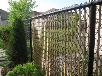 Еще один способ украсить забор из рабицы – «вплести» в сетку деревянные планки. Для декора также можно позаимствовать идеи из жаккардовых узоров, различных орнаментов, вышивок или пиксельной графики. Ячейки сетки представляют собой основу для стежков или пикселей, а сам рисунок создается из пластиковых лент, капроновых веревок и других подходящих материалов.