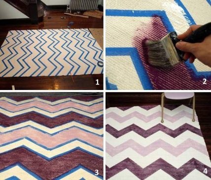 Он взял за основу дешевый белый коврик и решил придать ему интересный вид своими руками с помощью узора шеврон. Все, что ему понадобилось — тонкая клейкая лента, ножницы, толстая кисть и латексная краска двух разных оттенков.
