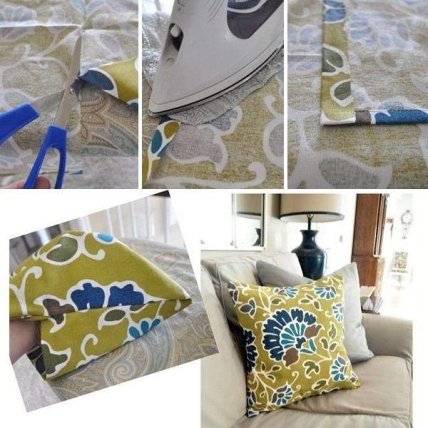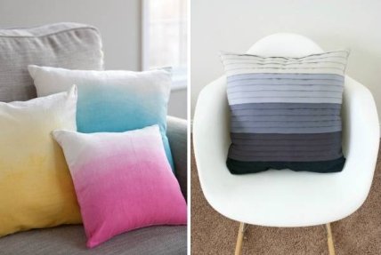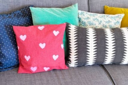 Если же вы не желаете покупать новую ткань или не имеете швейной машинки, то всё равно можете обновить старые подушки, окрасив их в новый цвет или создав узоры с помощью трафарета (по тому же принципу, как это проделывают с коврами — см. инструкцию выше).