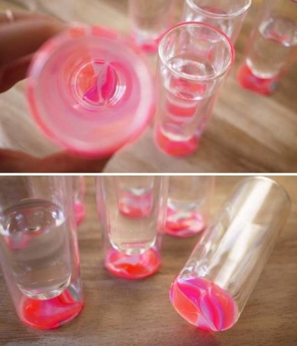 Наливаем воду в одноразовый контейнер. Открываем все пузырьки лака для ногтей, кроме прозрачного, и начинаем капать лаком с кисточки в воду, по одному цвету за раз. Слой каждого следующего цвета должен наноситься поверх предыдущего.