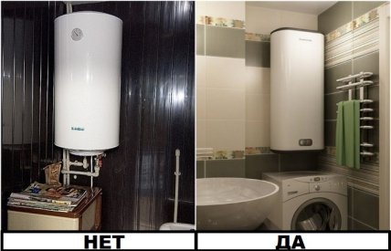Бойлер можно устанавливать или в нишу, или над унитазом, предварительно убедившись, что стена сможет выдержать нагрузку в виде прибора выбранного объема (гипсокартонная поверхность не подходит для этих целей). Однако есть и хорошая новость: в отличие от газовой колонки, водонагреватель можно прятать как угодно, например, за шторкой или деревянными фасадами.
