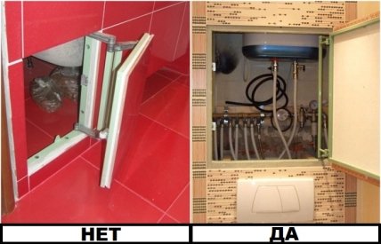 Зачастую при ремонте в ванной хозяева ставят во главе красоту и аккуратность: им хочется, чтобы комната выглядела стильно, актуально и уютно. Однако санузел входит в ту категорию помещений, которые в первую очередь должны быть практичными. Так, если спрятать коммуникации за небольшими или невидимыми люками, замаскированными под плитку, будет очень сложно менять детали при протечке.