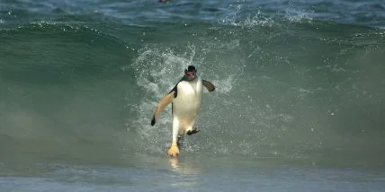 , к которым относятся и Фолклендские, и считается самым быстроплавающим среди всех пингвинов мира. Скорость передвижения этих забавных птиц может достигать 36 км/час. Но наше внимание привлекает совершенно не это, а то, с каким мастерством эти удивительные существа покоряют океанические волны. Все снимки сделаны на восточном побережье острова Нью-Айленд. Этот остров не отличается от остальных островов архипелага абсолютно ничем. Единственная особенность – этот остров полностью является заповедником. Фотографу-любителю по имени Шану Субра (Shanu Subra) удалось провести на острове 26 дней, наблюдая за этими чудесными созданиями. В результате появилась целая подборка фотографий с пингвинами-серферами.