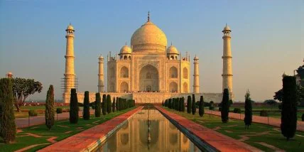 Тадж-Маха́л - мавзолей-мечеть в Агре (Индия). Построен по приказу потомка Тамерлана - падишаха империи Великих Моголов Шах-Джахана в память о жене Мумтаз-Махал, умершей при родах 14-го ребенка (позже здесь был похоронен и сам Шах-Джахан). Памятник считается шедевром архитектуры Великих Моголов. Здание начали строить примерно в 1632 году и завершили в 1653-м. Стены выложены из полированного полупрозрачного мрамора с инкрустацией из самоцветов.