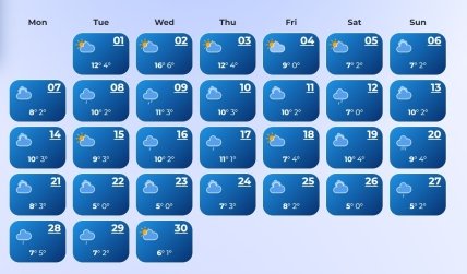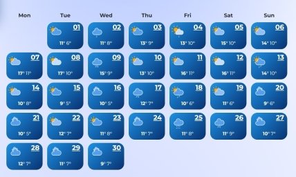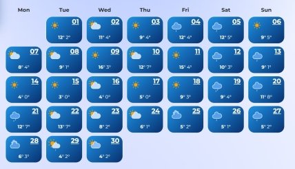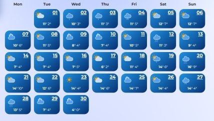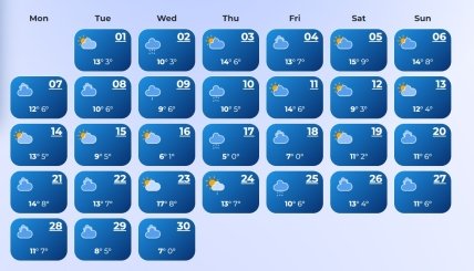 В городе Днепр снег будет четыре раза в месяц, а именно 2, 10, 17 и 25 ноября. Ниже нуля температура не будет опускаться вообще. 17, 18 и 30 числа ожидается минимальная температура – ночью она составит 0 градусов.