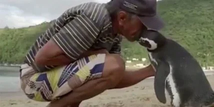 Трогательную историю взаимоотношений бразильского пенсионера Жоао Перейра и пингвина по кличке Дин-Дим опубликовало издание DailyМail. Оказалось, что в 2011 году пожилой мужчина обнаружил крошечную птицу, умирающую от голода в крупной расщелине в прибрежных скалах. Тело пингвина было покрыто маслом и мазутом, а оперения почти не было. Старик спас изможденное животное от верной гибели, кормил и ухаживал за своим новым другом, а когда пингвин, которому дали кличку Дин-Дим, окончательно окреп, он отправился вплавь к берегам Аргентины и Чили на период размножения. Каково же было удивление старика Перейры, когда полгода спустя его Дин-Дим вернулся в Бразилию, чтобы вновь повстречаться со своим спасителем. Пингвин сразу узнал мужчину, который спас ему жизнь, и с тех пор за их трогательной дружбой наблюдает все побережье. Восемь месяцев в году птица проводит рядом со своим спасителем, а на оставшееся время уплывает в Чили, чтобы обзавестись потомством. Ежегодно Дин-Дим преодолевает расстояние, рекордное даже для водоплавающей птицы: его путь занимает около пяти тысяч миль (это больше восьми тысяч километров).