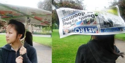 EcoBrolly (brolly — британское сленговое выражение для слова «зонт») — «умная» конструкция из перекладин,которую придумала Shiu Yuk Yuen, дизайнер, живущая в Лондоне. Эта конструкция должна защищать от дождя, только вот покрывающая часть, сам зонт, у неё отсутствует. Как раз её, эту самую главную часть, вы должны прикрепить сами, и это может быть газета, оберточная бумага или пластиковый пакет. Газета от дождя, конечно, не спасет, а вот от палящего солнца — вполне.