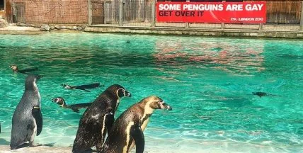 Работники зоопарка сделали специальный мини-баннер для дома Пингвин-Бич, где проживают самые известные жители зоопарка, пингвины Гумбольдта Ронни и Реджи. На транспаранте написано: "Некоторые пингвины - геи. Живите с этим".