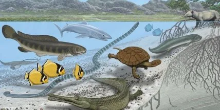 Однако жизнь здесь была изобильна. Берега, по-видимому, покрывали мангровые заросли, в море плавали необычные создания, останки которых обнаруживаются в наши дни, включая вымерших полутораметровых кальмаров и крупнейшую из известных морских змей, которая достигала 12 метров в длину. Встречаются здесь и кости древних родственников крокодилов, акул и других рыб — все довольно крупные.