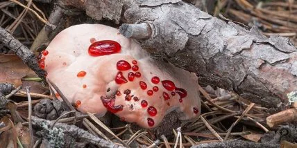 Гиднеллум Пека (Hydnellum peckii) - это не растение, а гриб, однако его весьма специфический внешний вид настолько характерен, что о нем просто нельзя не упомянуть. Гиднеллум похож на небольшой белый гриб, обрызганный кровью. Собственно, именно из-за этого его в народе и называют "кровоточащим грибом". Чем старше этот гриб, тем он становится темнее и тем труднее его увидеть в лесу. Интересно то, что гриб теоретически съедобен, но есть его все равно не стоит - он имеет очень сильный горький вкус.