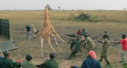 В 2016 году защитники природы узнали, что в Уганде обнаружили нефть, и что нефтеразведчики планируют переехать в Национальный парк Мерчисон Фоллс (Murchison Falls National Park). Особенно уязвимая группа жирафов жила только с одной стороны Нила, и, к сожалению, именно в этом месте была нефть. Была проведена смелая операция, в ходе которой удалось уложить 20 неуклюжих, но опасных животных, поместить их на паром и перевезти на другою сторону. Мало того, что небольшое стадо чувствовало себя прекрасно, но наблюдавшим за животными исследователям удалось заснять ранее неизвестное поведение жирафов. По ночам животные по очереди высматривали хищников, в то время как остальные спали, закинув шеи на спину, как лебеди.