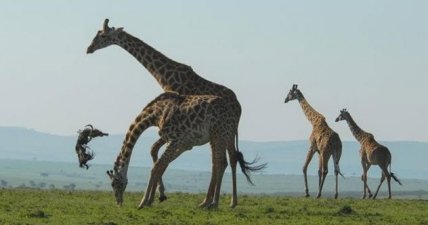 Фотограф National Geographic Корин Кендалл (Corinne Kendall) несколько лет назад посетила один заповедник. Оказавшись в Национальном заповеднике Масаи Мара в Кении (Kenya’s Masai Mara National Reserve), она запечатлела жуткую картину. Два взрослых жирафа возились у тела мертвой антилопы Гну. Они не только жевали тушу, но время от времени подбрасывали ее в воздух. Это противоречило образу жирафа как нежного травоядного. Эксперты просмотрели фотографии и обнаружили, что такое поведение не было каким-то отклонением, как казалось вначале. Вероятно, это был случай остеофагии. Чтобы сохранить здоровье скелета, травоядным нужен кальций и фосфор.