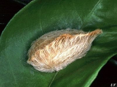 Эта моль очень пушистая, особенно ее личинки. Они могут выглядеть милыми, но НЕ ТРОГАЙТЕ ИХ! Как и у многих гусениц, у этих насекомых есть защитные механизмы: эти волоски – на самом деле ядовитые иглы. Конечно, вас это не убьет, но будет больно. Потребуется медицинская помощь.