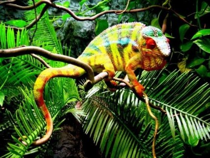 Способность хамелеонов менять окрас помогает им спасаться от врагов. Расцветка меняется в зависимости от яркости света, температуры и настроения животного.