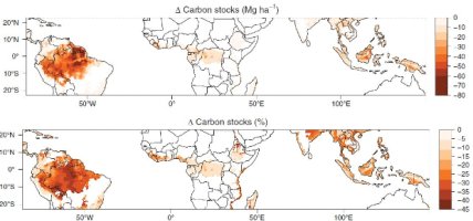 Долгосрочный отклик тропических лесов на изменение климата - ключевая неопределенность в существующих климатических моделях. Их важнейшая роль в углеродном цикле, а следовательно, и в регуляции климата, не вызывает сомнений, но предсказать изменения биогеохимических потоков этих экосистем на долгие годы вперед достаточно трудно. Краткосрочные наблюдения за тропическими лесами показали, что повышение температуры воздуха и засухи угнетает рост деревьев и усиливает их дыхание, что приводит к общему снижению продуктивности и способности к секвестрации углерода.