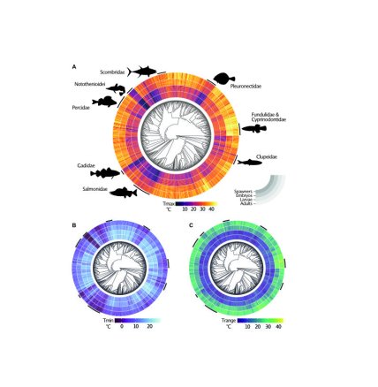 Филогенетические и онтогенетические закономерности в термической толерантности рыб (A-C). Круговые хронограммы показывают (A) верхние температурные пределы (Tmax), (B) нижние температурные пределы (Tmin) и (C) диапазоны термической толерантности (Trange) видов и их этапы жизни изнутри наружу: потомки, эмбрионы, личинки и взрослые. Выделяются видные таксономические группы, в частности теплые, теплые (Fundulidae и Cyprinodontidae) и холодные стенотермальные группы (Notothenioidei). Предоставлено: Доктор Далке и др., Science (2020)