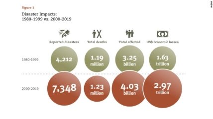 По данным Управления ООН по снижению риска бедствий, в период с 2000 по 2019 год произошло 7 348 крупных стихийных бедствий, включая землетрясения, цунами и ураганы, которые унесли 1,23 миллиона жизней, затронули 4,2 миллиарда человек и привели к глобальным экономическим потерям в размере 2,97 триллиона долларов США.