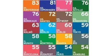 Как и можно было ожидать, на 1-м месте в рейтинге - Амстердам. На 3-м и 6-м месте - еще 2 голландских города — Утрехт и Эйндховен, соответственно. На 2-м месте, также ожидаемо, - Копенгаген. Далее, на 4-м месте, - Севилья в южной Испании. На 4-м и 5-м - французские Нант и Бордо. 5-е место занимает бельгийский Антверпен. Подробности - на фото.