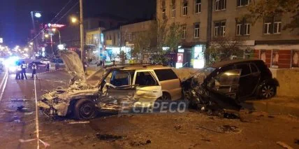 По информации с места происшествия, автомобиль Opel Vectra Caravan, который двигался в направлении ст. м. "Дорогожичи", по невыясненным причинам, выехал на полосу встречного движения, где столкнулся с автомобилем Smart Fortwo. От удара малолитражку отбросило в ограждающий барьер, одна железобетонная плита в результате столкновения упала с Шулявского моста, а сам Смарт чуть не слетел с путепровода, зависнув в воздухе.