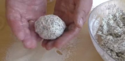 Теперь добавляем муку, перемешиваем и формируем колобки (100 гр). Руки слегка смочите водой, будет удобнее катать.