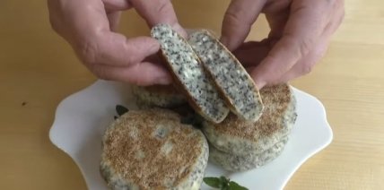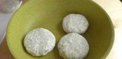 Каждый колобок обсыпали (обваляли) в манке и формируем творожно-маковую шайбу, толщиной 1,5 см. Жарим на сухой сковороде под крышкой, на медленном огне.