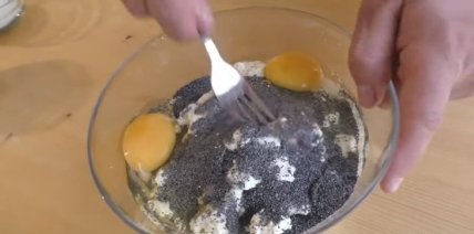 Мак, соль, сахар и яйца отправляем в творог и хорошо разминаем (перемешиваем) вилкой. Можно воспользоваться погружаемым блендером.