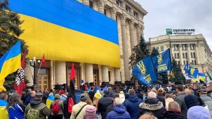 Несколько сотен участников пришли к зданию Харьковской облгосадминистрации. Туда также принесли бочки с надписями "ПТН ПНХ", а возле входа установили звуковую аппаратуру.