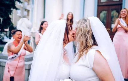 В Харькове пара женщин провела перформанс, в котором обыграла свою свадьбу. Это по задумке организаторов должно было указать на невозможность ЛГБТ пар вступать в законные браки, а военное время лишь усиливает проблему.