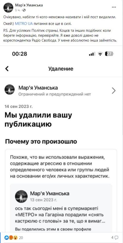 В Харькове охранник торговой сети "Метро" оскорбил журналистку Марью Уманскую и посоветовал ей "снять кастрюлю с головы" в ответ на просьбу говорить с ней на украинском языке.