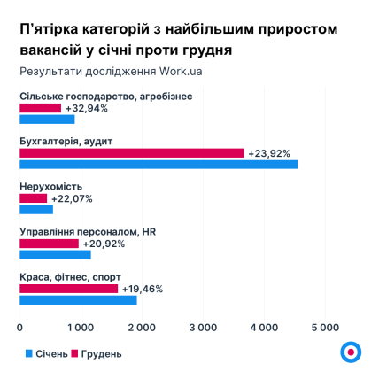 Также в пятерку категорий с наибольшим приростом вакансий в январе вошли: "Бухгалтерия, аудит" (+24%), "Недвижимость" (+22%), "Управление персоналом, HR" (+21%), "Красота, фитнес, спорт" (+19%).