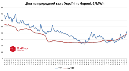 В частности, средняя цена на природный газ на TTF Day Ahead в июле составила около €30/MWh, что соответствует цене в Украине. Однако уже в августе средняя цена в Украине составила €33,4/MWh, в то время как в Европе — €32,5/MWh. Отдельные резкие скачки цен в Европе были связаны главным образом с форс-мажорами, например, ремонтными работами в Норвегии или угрозой забастовок на LNG-заводах в Австралии.