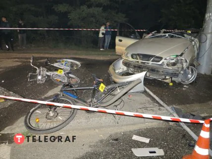 "Ланос" врезался в высокий бордюр и, продолжив движение, протаранил мачту уличного освещения. После этого автомобиль задел двух пешеходов з велосипедами, которые ждали зеленый сигнал светофора, чтобы перейти дорогу.