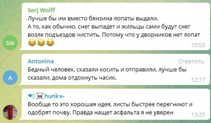 В комментариях пользователи посоветовали руководству выдать дворникам лопаты вместо бензина для заправки кос, чтобы они были готовы к выпадению снега. Также отметили, что разрубленные триммером листья быстрее перегниют и будут полезны для грунта.