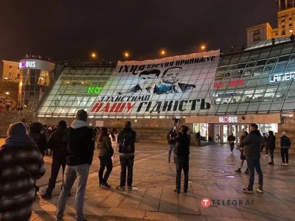 Вечером на Майдане Независимости в Киеве сотни человек приняли участие в торжественном памятном шествии, посвященном очередной годовщине начала Революции Достоинства. Плакаты, файеры и даже огромный баннер с "приветом" Владимиру Зеленскому и Андрею Ермаку — так столица проводит вечер воскресенья, 21 ноября.