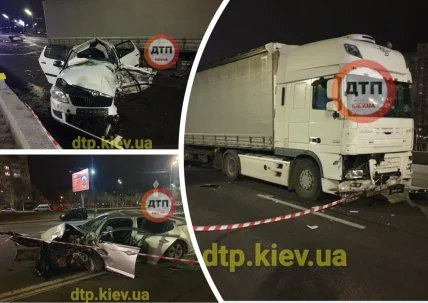 В Киеве в последнее время стало значительно больше аварий с участием грузовиков. Одно из таких ДТП произошло в ночь на субботу, 27 ноября, на улице Братиславской — две легковушки столкнулись лоб в лоб, после чего одну из них отбросило под колеса фуры.