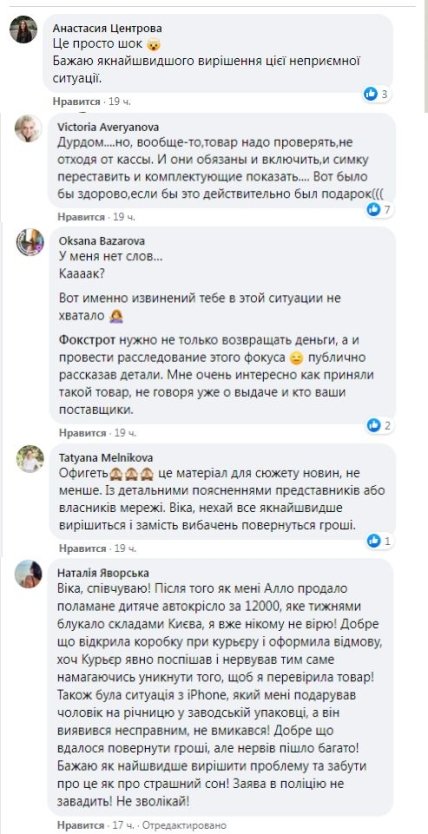 "Кажется, кто-то из работников Фокстрота (по телефону или в магазине) говорил, что в течение 8 часов какое-либо решение будет, но прошло уже больше, но ничего конкретного не произошло. Многие извинения, но что мне с ними сделать? Я их не обменяю на 24к", — отметила она.