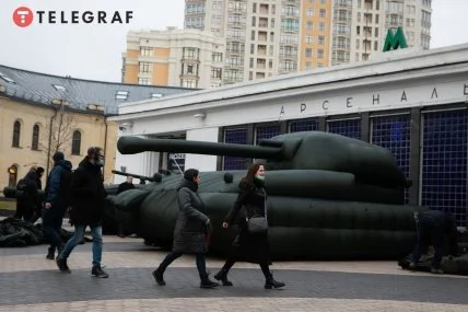 Оказалось, что импровизированная "выставка" надувных танков рядом со станцией метро "Арсенальная" — своего рода протест. Изготовитель таких "макетов" выиграл специальный тендер, после чего потратил материалов на 1,2 млн гривен.