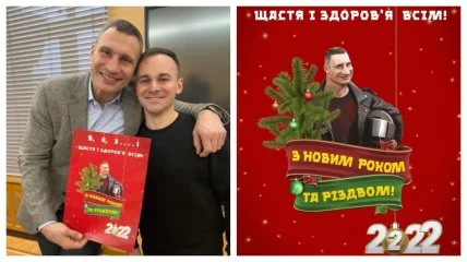На снимке Кличко запечатлен со знакомым, солистом группы Karta Svitu Иваном Маруничем, а в руках у него — специальный подарочный постер с собственным фото. На новогодних шариках имеется все та же цифра 2222, что доказывает высокий уровень самоиронии столичного мэра.