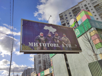 На патриотических плакатах рядом с Гогилашвили стоят несколько мужчин в военной экипировке и оружии, но их лица заретушированы. Надпись на борде: "Мы готовы. А ты?"