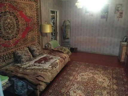 Согласно объявлению квартира меблирована — на фото видны диван, ковры на стенах и полу, мебельная "стенка", кухонная бытовая техника, а туалет оборудован специальным шкафчиком.