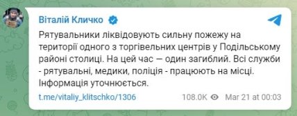 На территории попавшего под обстрел ТЦ возник сильный пожар. По словам мэра Киева, уже известно, что по меньшей мере один человек погиб.