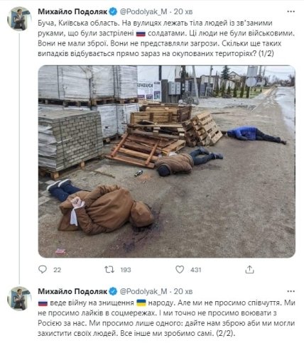 Кроме того, как сообщил советник главы Офиса президента Михаил Подоляк в своем Твиттер, после возвращения города под контроль украинских сил, на улицах были обнаружены тела убитых украинцев со связанными руками.