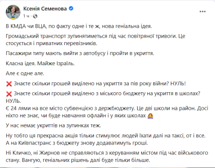 "Остановка во время воздушных тревог наземного транспорта и освобождение его от пассажиров (когда на самом деле прятаться некуда) — это не забота городских властей о безопасности граждан, а снятие с себя ответственности за теоретически возможные негативные последствия", — прокомментировал свою позицию он.