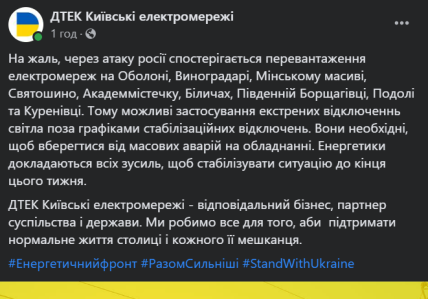 В результате непредсказуемости обстрелов (куда именно и в какое время прилетит ракета россияне не предупреждают) и срочного возникновения дефицита, стабилизировать энергосистему часто приходится в экстремальном режиме. Если появляется указание сократить потребление более чем на 250 МВт, то отключения становятся аварийными. А значит, будут происходить не по графику и расписание отключений не соответствует действительности. Например, сегодня так произошло с Сумской, Харьковской и Полтавской областями — графики там пока не действуют.