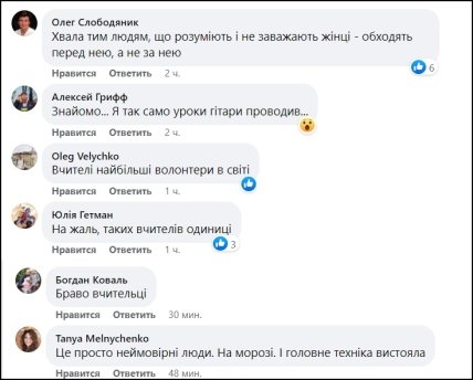"Титанесса", "Какая отдача", "Таких учителей единицы", "Учители наибольшие волонтеры в мире", "Браво", "Это просто невероятные люди. На морозе, и техника выстояла", "Нас не преодолеть", "Это призвание", — среди прочего, пишут в комментариях.