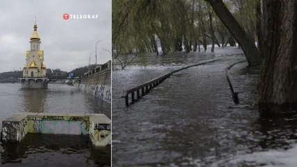 Из-за подъема воды в Днепре произошло серьезное подтопление береговой линии, где теперь абсолютно невозможно движение транспорта и пешеходов.