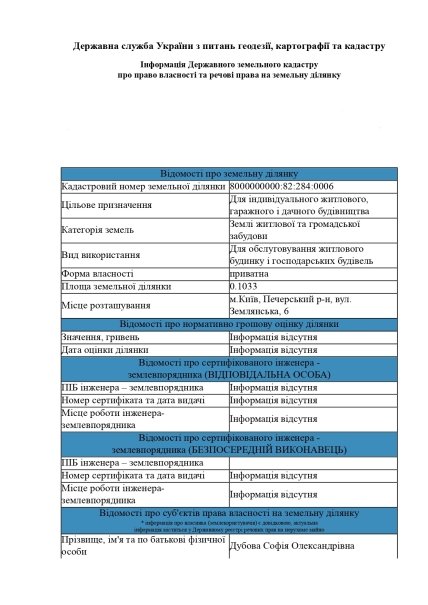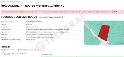 Но это еще не все. По данным того же Госгеокадастра, еще два соседних участка также находятся в собственности семьи экс-парламентария. В частности, речь идет о Землянской, 5 (площадь – 0,098 га). Данный земучасток также записан на Светлану Дубовую. А вот имение по ул.Землянская, 6 (кадастровый номер — 8000000000:82:284:0006) записан на дочь Александра Дубового — Софию. Площадь этой земли составляет чуть более 10 соток.