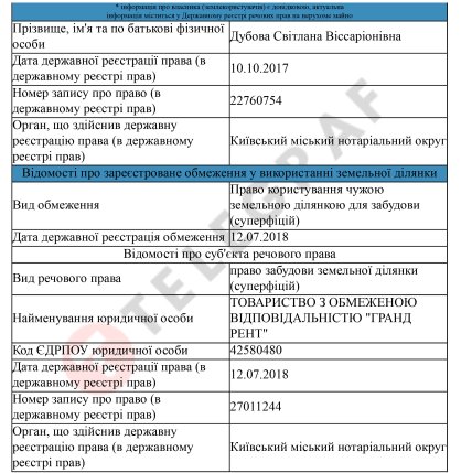 Как отмечается в выемке Госгеокадастра, соседом "Паши-Мерседеса" и Халимона является Дубовый. В частности, речь идет об участке по ул.Землянская, 7 (кадастровый номер — 8000000000:82:104:0018). Площадь участка – 10 соток. Формальной владелицей земли является жена Дубового — Светлана Дубовая. Право собственности получено в 2017 г.