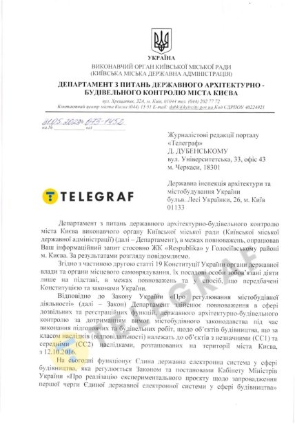 На запрос "Телеграфа" в Департамент КГГА по вопросам архитектурно-строительного контроля Киева директор Оксана Попович ответила, что: "Заказчикам строительства, ООО "Мегаполисжилстрой" и ООО "Теремки-Буд", выдали… разрешение на выполнение строительных работ "Строительство жилой застройки с автовокзалом на территории по ул. Кольцевая дорога, 1, 1А, 1В, ограниченной улицами Кольцевая дорога, западной границей застройки по улицам Теремковской, Жулянской и городской границей в Голосеевском районе г. Киева № КВ1l411117510".