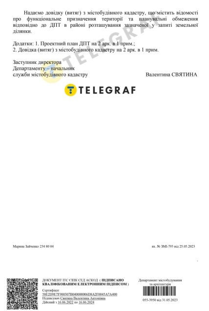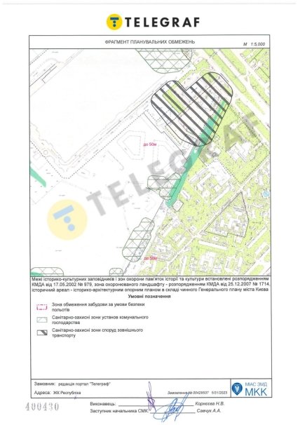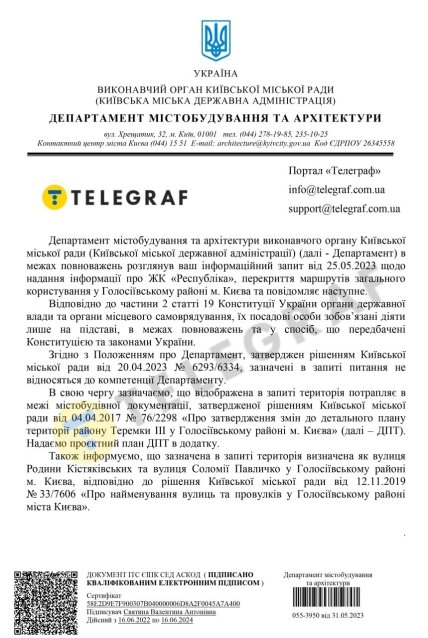 Вместе с тем в Департаменте КГГА градостроительства и архитектуры "Телеграфу" отметили, что отображенная в запросе территория попадает в пределы градостроительной документации, утвержденной решением Киевгорсовета от 04.04.2017 № 76/2298 "Об утверждении изменений в детальный план территории района Теремки III г. Киева" (ДПТ).